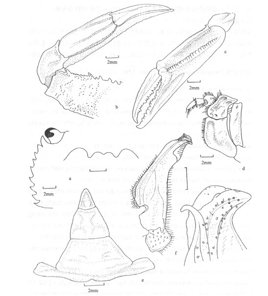 ,呈棍棒状,着生于前节的内基角,超越前节的末端。螯足毛少,腕节内緣基部有短毛,掌节内面腹部具一列短毛,延伸至不动指末端,可动指内緣基部具一