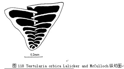 或稍凹,缘角突、锐或亚锐;单列部分口面观呈圆三角形或略呈菱形。缝合线不清楚或稍清楚。壳壁粗砂质,3列部分壳面较