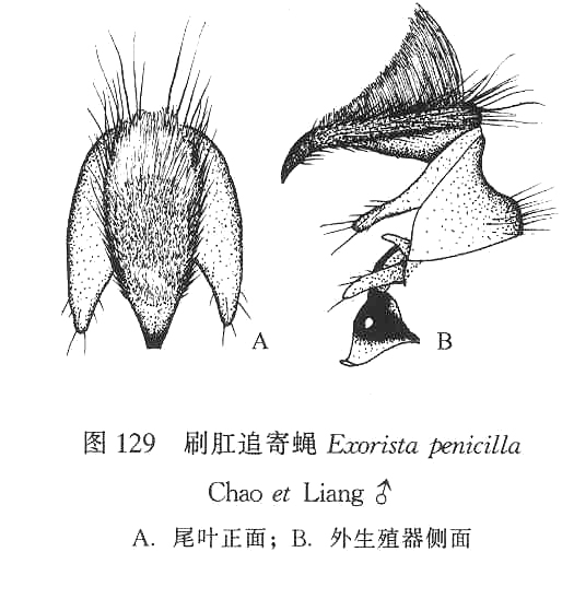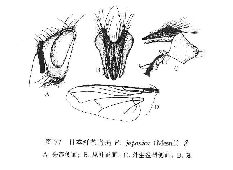 背板黑色,被黄褐色短毛;侧板及小盾片同背板;小盾片盾下毛长。腹部细长;第4节最长,黑色,具光泽,背板被黑色短毛,基部两侧被较长白毛。...