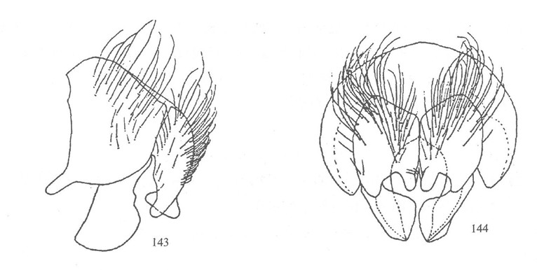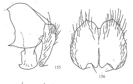 雄性 头顶隆起,被黑色长毛,单眼三角呈等边三角形;额明显隆起,亮黑色,近复眼被灰色粉被和黑色长毛;颜亮黑色,被淡色粉被,中突和口缘裸,颜下半部被较长的黑色毛,中突小;眼缘褐色,中等宽,最宽处宽于第3触角节的1/2,略具粉被,被中等长淡色毛;颊低,被淡灰色粉被...
