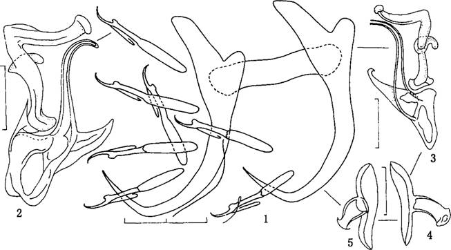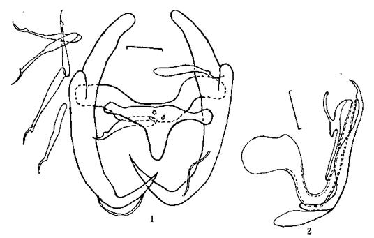 形态 据封片,体长0.230mm,体宽0.041mm,边缘小钩0.017-0.021mm。中央大钩全长0.047mm,基部长0.032mm,内突长0.031mm,外突不发达,小于0.O01 mm,钩尖长0.Ol4mm。联结片略弯0.002×0.OlOmm...