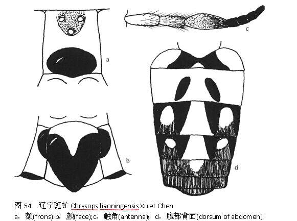 黄色毛。复眼被毛明显。触角黑色,第3节基部有时带红色;芒黑色。中胸背板黑色,被黄色较长毛,两侧略...